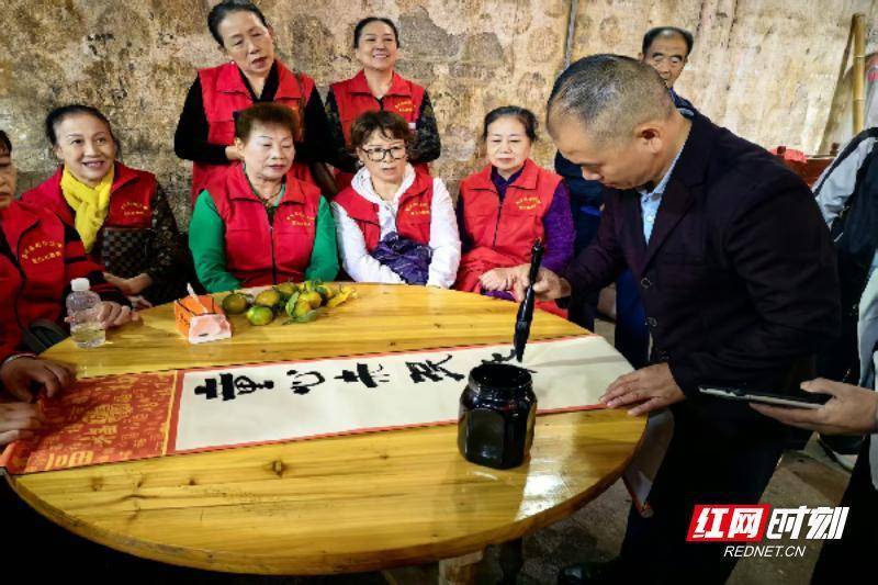 另一边的书画创作区墨香四溢,县老年大学书画班的师生们现场挥毫泼墨,凝神聚力地创作着书法和绘画作品。“福如东海”“寿比南山”“童心未泯”等一幅幅寓意吉祥、笔力遒劲的书法作品,以及栩栩如生的山水、花鸟绘画作品相继完成,被一一送到老人们手中。“‘童心未泯’写得真好!这样的‘礼物’比什么都珍贵,我要好好珍藏起来。”收到书法作品的尹振杰老人爱不释手,连连向创作的老师表示感谢。墨香与欢笑交织,现场充满了温馨祥和的氛围。