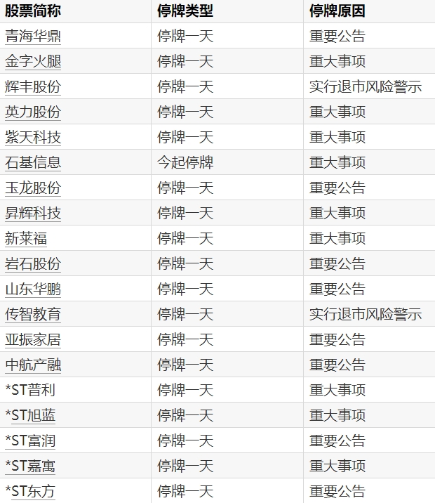 A股停牌提示:19股今日停牌A股停牌提示:19股今日停牌