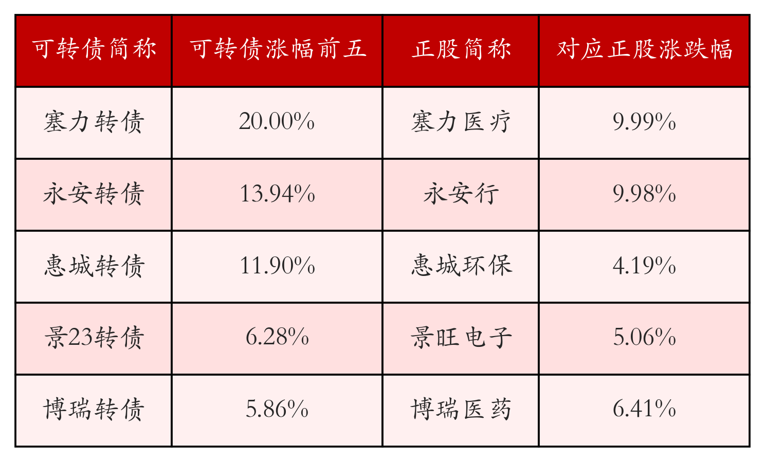 南财金融终端盘后数据显示,债市方面,中证转债指数收涨0.56%,报446.81,成交额为660.85亿元。可转债方面,今日共成交466只可转债,其中405只收涨,1只收平,60只收跌。具体来看,27只可转债涨幅超过2%。其中塞力转债(113601)涨20.0%,永安转债(113609)涨13.94%,惠城转债(123118)涨11.9%。今日有9只可转债跌幅超2%,测绘转债(123177)跌8.15%,应急转债(123048)跌5.15%,飞鹿转债(123052)跌4.55%。存在交易量的可转债所对应的正股中,293只收涨,18只收平,155只收跌。具体来看,26只可转债对应正股涨幅超过5%,其中,苏利股份(603585)涨停,收涨10.01%;华海药业(600521)涨停,收涨10.01%;美诺华(603538)涨停,收涨10.01%。同时所对应的可转债:苏利转债(113640)同涨5.15%;华海转债(110076)同涨3.53%;美诺转债(113618)同涨3.77%。今日有5只可转债对应正股跌幅超过5%,没有正股跌停。
