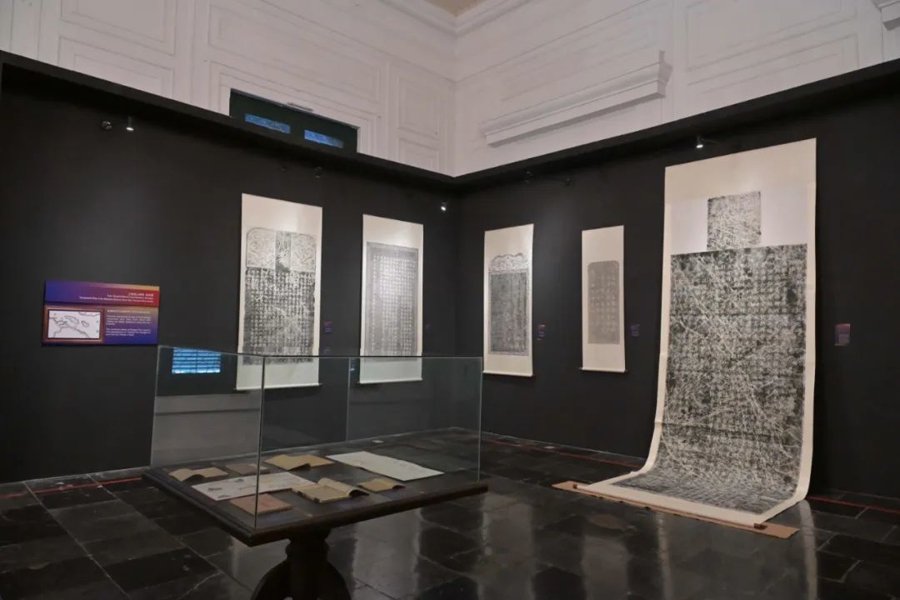 展厅中,一张宝船示意图显示:宝船是郑和船队的核心和领导,负责装运封赏礼品、西洋各国贡品,海外贸易所获奇珍异宝,其最大尺寸可达四十四丈(约合126米)长、十八丈(约合51米)宽。《郑和航海图》透露了“过洋牵星术”是郑和下西洋时采用的一种天文导航定位技术,通过观测星辰的海平仰角高度,判断船只在南北方向上的位置变化。郑和下西洋随行通译马欢所著《瀛涯胜览》,是其随郑和亲历二十国风物、详实记录海上丝路见闻的珍贵文献。明御制弘仁普济天妃宫之碑拓片(局部)为国内最大的郑和下西洋记事石刻。藏于雅加达省立陶瓷和美术博物馆的明代万历年间(1610-1630年)青花瓷,是郑和带来贸易往来的实证。徜徉展厅,观众在历史与现代交织的光影中,感受到那份跨越时空的文明力量。