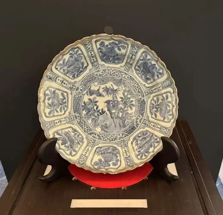 而一件明代漳州窑红绿彩近悦远来瓷盘,中心绘制西式罗盘,四周装饰着西式帆船、飞鱼、山水。瓷盘的外圈写有“近悦远来”,出自《论语·子路》中的“近者悦,远者来”。
