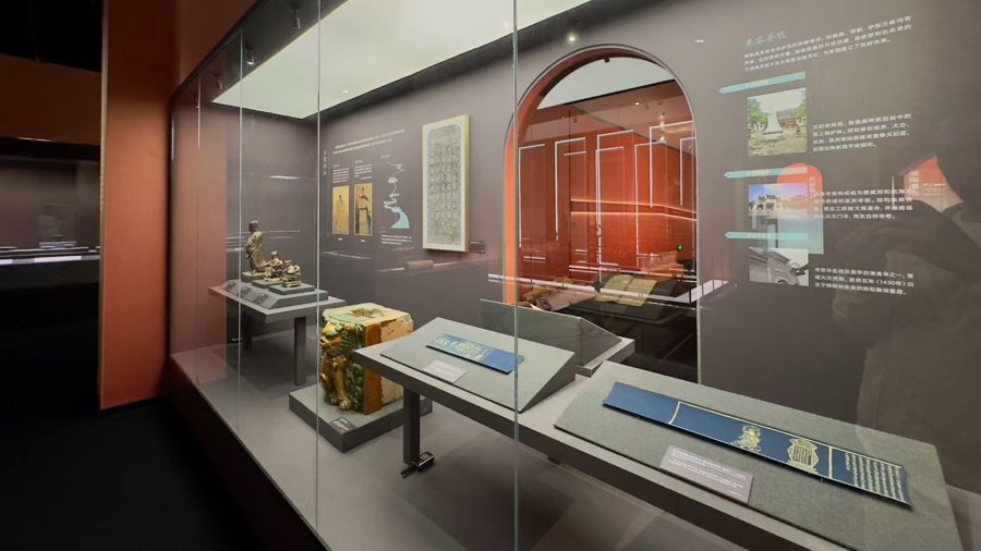 展厅中,一件南京市博物馆收藏的大报恩寺琉璃塔构件引人关注,属国家一级文物。大报恩寺是明成祖朱棣为纪念父母而下令营造,郑和曾负责督建。有记载:大报恩寺琉璃宝塔高达78.2米,通体用琉璃烧制,自建成至衰毁一直是中国最高的建筑,有“中国之大古董,永乐之大窑器”之誉。从此番亮相的精美构件,便能窥得“天下第一塔”的壮美。该构件施有黄、绿、赭等釉彩,看上去流光溢彩,上面浮雕着一只雄狮,狮子双目圆睁,凸鼻露齿,蹲伏远望,让人望而生畏。在中国古代佛教艺术中,狮子是护法神。