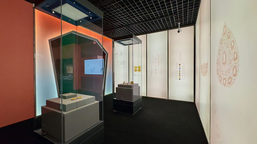 在郑和下西洋时期,大量中国纺织艺术以朝贡颁赐和贸易的形式传播至海外。展厅呈现的杂宝纹八达晕锦,纹样以垂直、水平和对角线相交,形成类似“米”字的图案,象征着八方辐射,寓意“四通八达,财路亨通”。