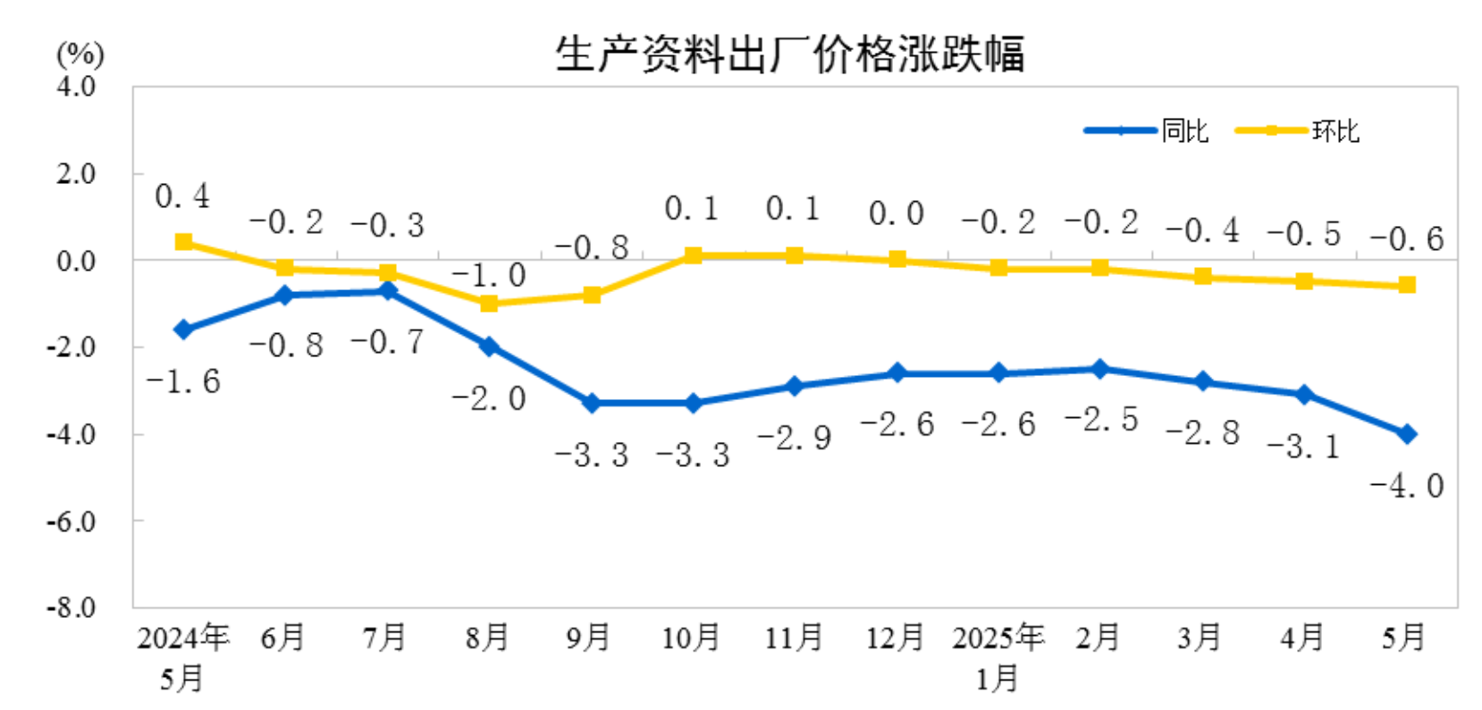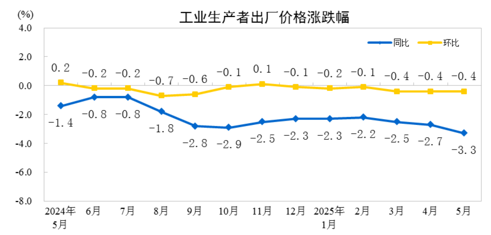 据国家统计局,2025年5月份,全国工业生产者出厂价格同比下降3.3%,环比下降0.4%;工业生产者购进价格同比下降3.6%,环比下降0.6%。1—5月平均元富投资,工业生产者出厂价格和购进价格比上年同期均下降2.6%。